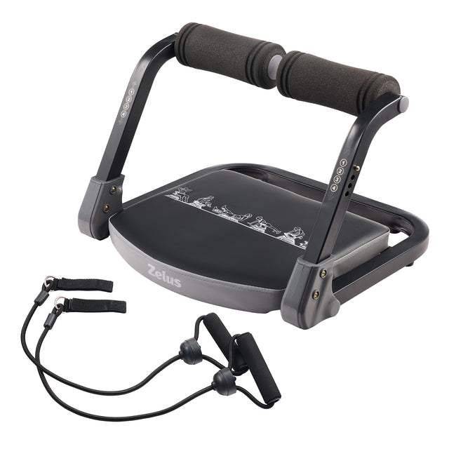 - 2-IN-1 AB MACHINE: This multipurpose ab machine by Zelus is the ideal strength training equipment for your home gym, bringing 4 resistance levels and a pair of arm resistance bands to create the perfect full-body workout in your living room, garage, or office